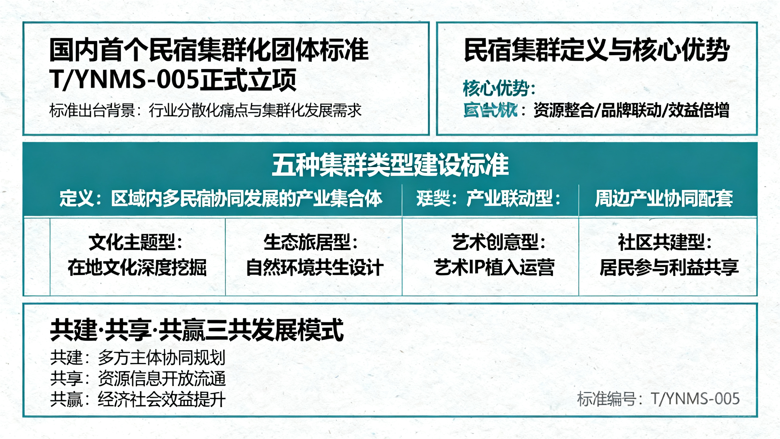 T/YNMS-005标准提出了民宿集群化发展的核心理念——"共建·共享·共赢"的"三共"模式。