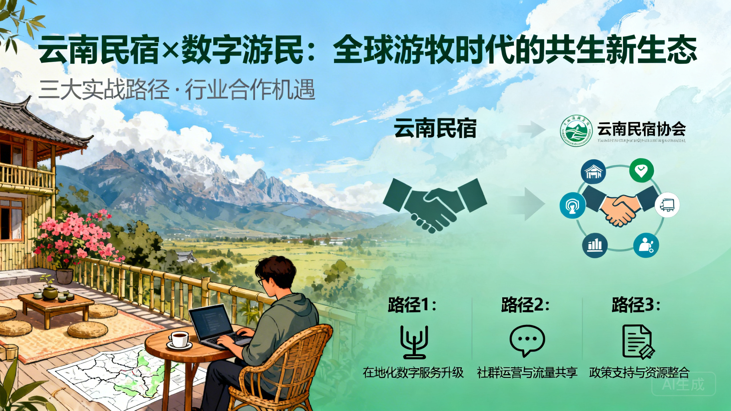 站在2026年这一 #云南民宿协会 确立的“高速发展年”的潮头,我们正亲历一场深刻改变人类生存状态的“生产力迁徙” 。随着AIGC(生成式人工智能)对传统工作效率的指数级提升,数以百万计的知识型从业者彻底解脱了办公位的物理桎梏,进化为真正意义上的“数字游民”(Digital Nomads)。