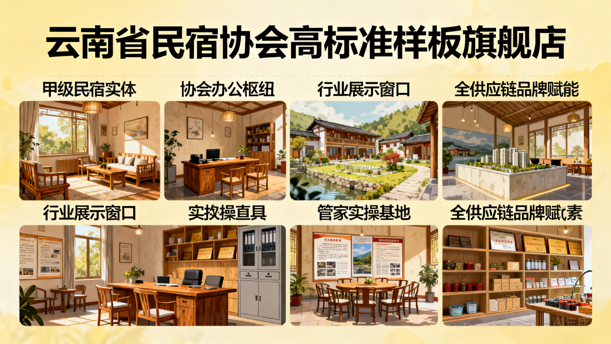 # 一、 项目愿景:定义行业新高度 为推动云南民宿产业规范升级,云南省民宿协会集结数百家供应链头部企业与顶尖设计师,倾力打造**“高标准民宿样板旗舰店”。这不仅是一座按照甲级民宿**标准建设的实体店,更是协会未来的办公枢纽、行业展示窗口及顶级民宿管家实操基地。